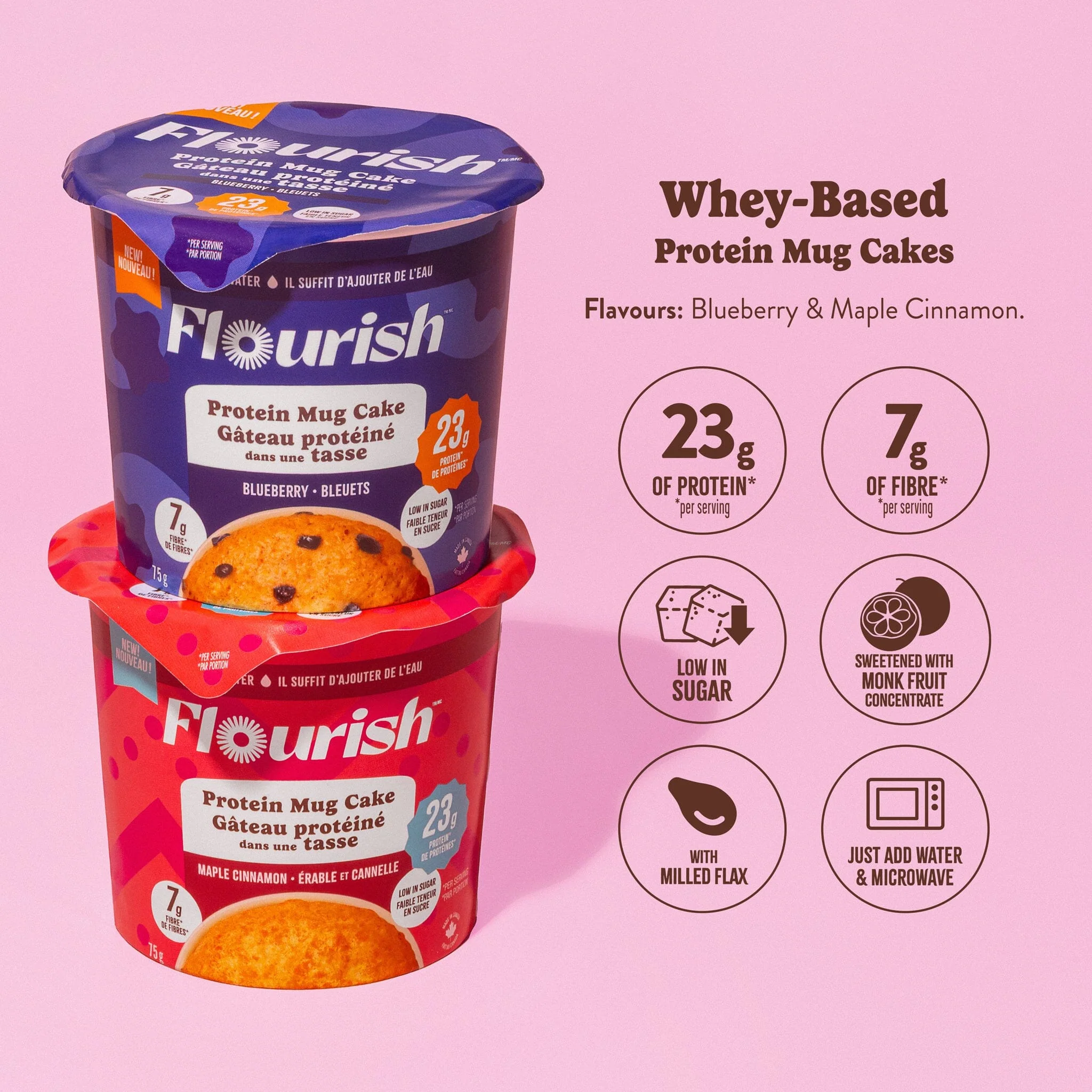 NEW! Flourish Protein Mug Cakes are perfect for breakfast on the go. Just add water, microwave for 90 seconds and you’ve got a protein rich breakfast that tastes flippin’ delicious! Available in Blueberry and Maple Cinnamon flavors, low in sugar, with 23g of protein and 7g of fiber, per serving.
